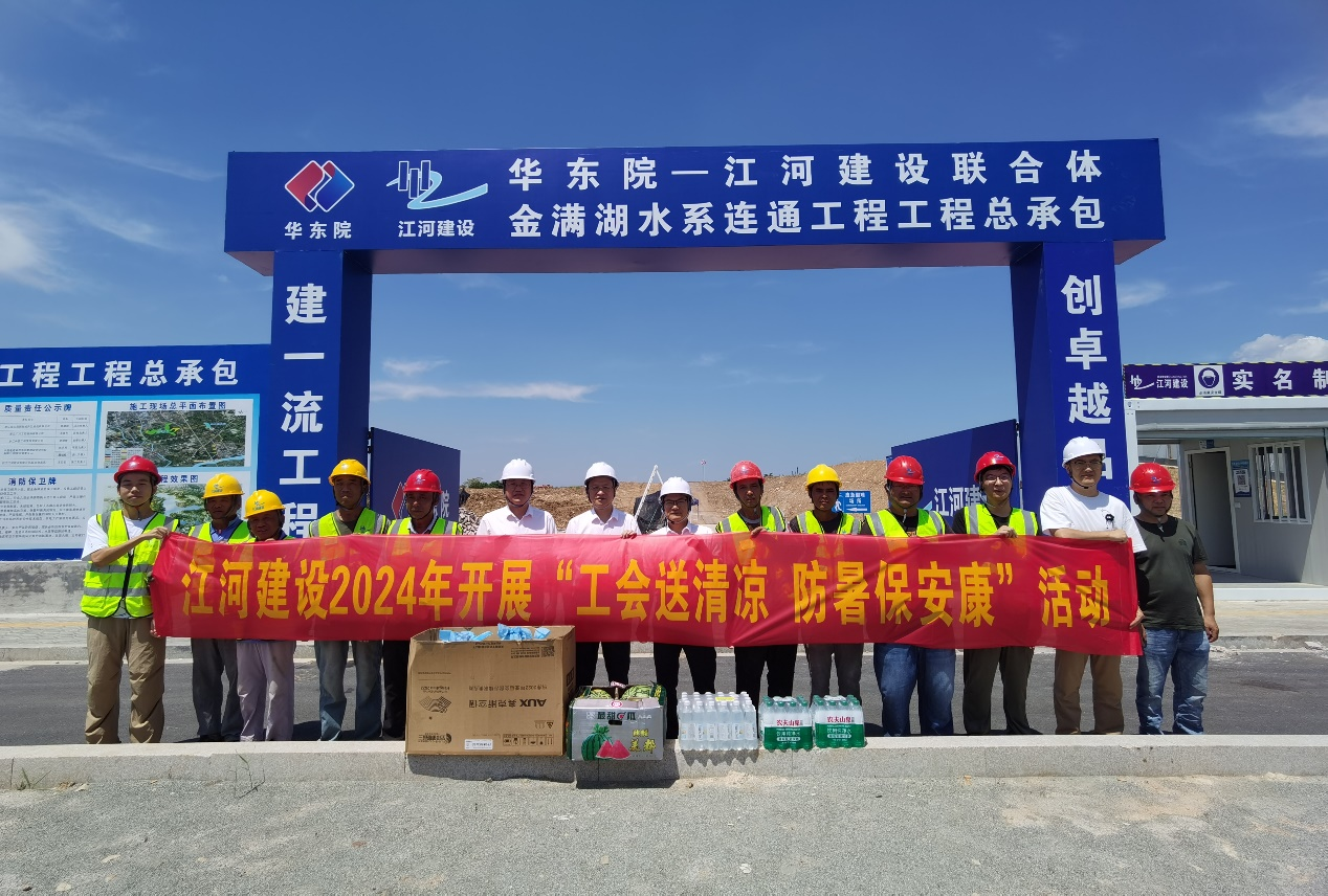 盛夏焦月,驕陽似火,江河建設各重點在建工程項目正在有序推進,一線的職工們備受“烤”驗。為有效改善職工生產生活條件,認真做好高溫天氣職工勞動保護工作。連日來,江河建設黨總支、工會組織開展“工會送清涼,防暑保安康”為主題的高溫慰問活動,成立有工會、總師辦、工程部、安全部等負責人組成的“紅+安全”慰問組,帶著袁偉忠董事長、陳宋江總裁的關懷問候和委托,深入全國各地的項目施工現場,慰問奮戰在高溫一線的項目工人,為其送去礦泉水、毛巾、風油精、西瓜、飲料、藿香正氣水等防暑降溫物品,并為他們的辛勤付出表示感謝。