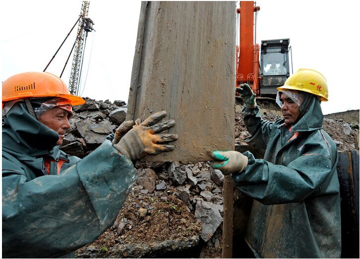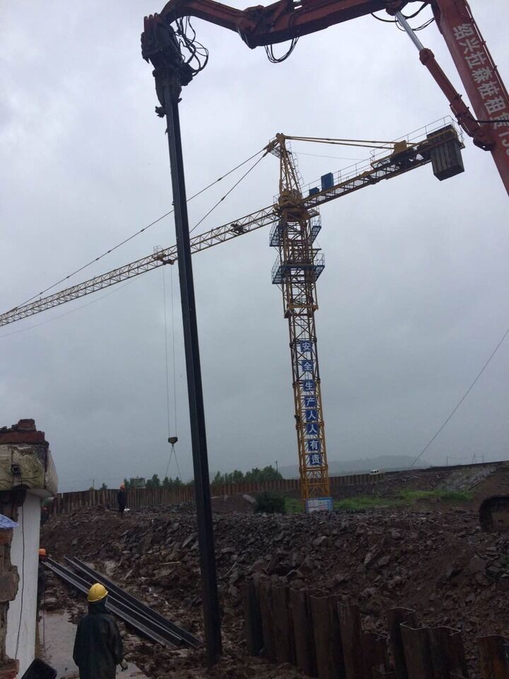 這是一項技術活,操作工人和地面上的2名工人密切配合,懸著的鋼板由地面的工人矯正位置,才能使1.5噸重的鋼板樁順利打入泥層。風雨中進行這樣的精細操作,尤其吃力,每臺打樁機每小時只能打入七八條。拉森鋼板樁一字排列,然后堆上3.5米高的拋石,確保海水無法倒灌。風雨越來越大,意味著高空作業的危險性也越來越大,40多名工人不敢有絲毫的分神。