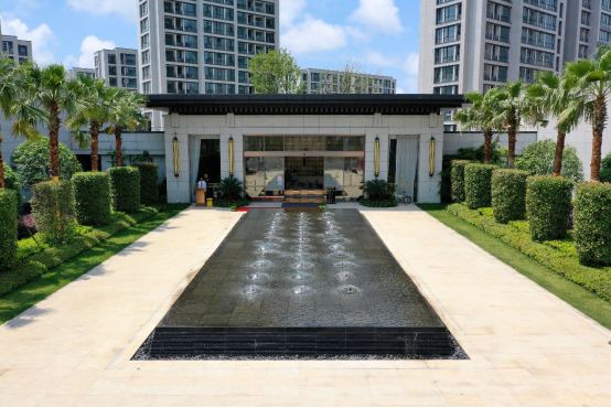 該工程全方位著眼考慮設計空間與自然空間的融合,不僅僅關注于平面的構圖及功能分區,還注重于全方位的立體層次分布。平面構成線條流暢,從容大度,空間分布錯落有致,變化豐富,再加上滿園的植物隨季節變換造成的景觀變遷,使整個景觀設計真正成為一個四維空間作品,無論春夏秋冬、無論平視鳥瞰,都能令人獲得愉悅的立體視覺效果。小區主入口兩側為對稱設計,兩邊種植華棕,中間為入口主水景,提升了本小區的氣勢和檔次,彰顯了小區的尊貴和高雅。小區中央的游泳池,各異的親水木棧臺提供了戲水空間,點綴著喬木與灌木,探水的石縫中延伸著地被植物,清澈見底的淺水中鋪滿了卵石,大大提升了景觀的親水特色。“宅中有園、園中有宅”,每一幢樓,都好像身處綠林花海之中,大面積的綠草坪隨處可見,綠植掩映間,設有休閑廊架、花架、崗亭、特色園亭等,供人休憩賞景,還有供小孩嬉鬧游玩的游樂園,構成了休閑自由的景觀空間。