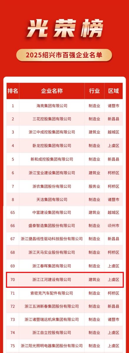 近日,紹興市企業聯合會、紹興市企業家協會聯合發布2025紹興市百強企業榜單,浙江江河建設有限公司位列70位,比上年上升3位。
